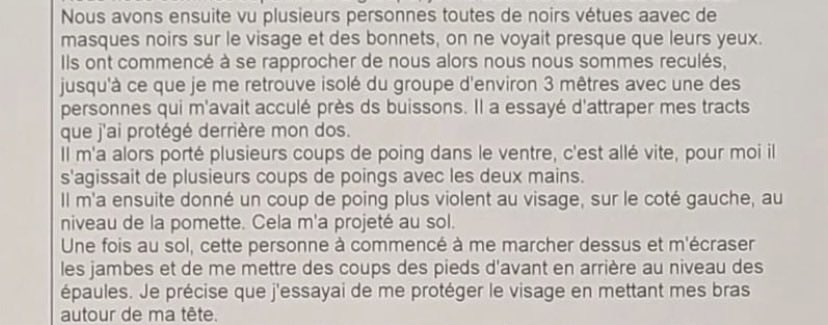 D’après une autre plainte que L’Observatoire a pu consulter, Augustin BRAHIM ACHOUR avait déjà participé à l’agression des militants de l’UNI sur le campus principal de Nanterre, le lundi 30 mars.
