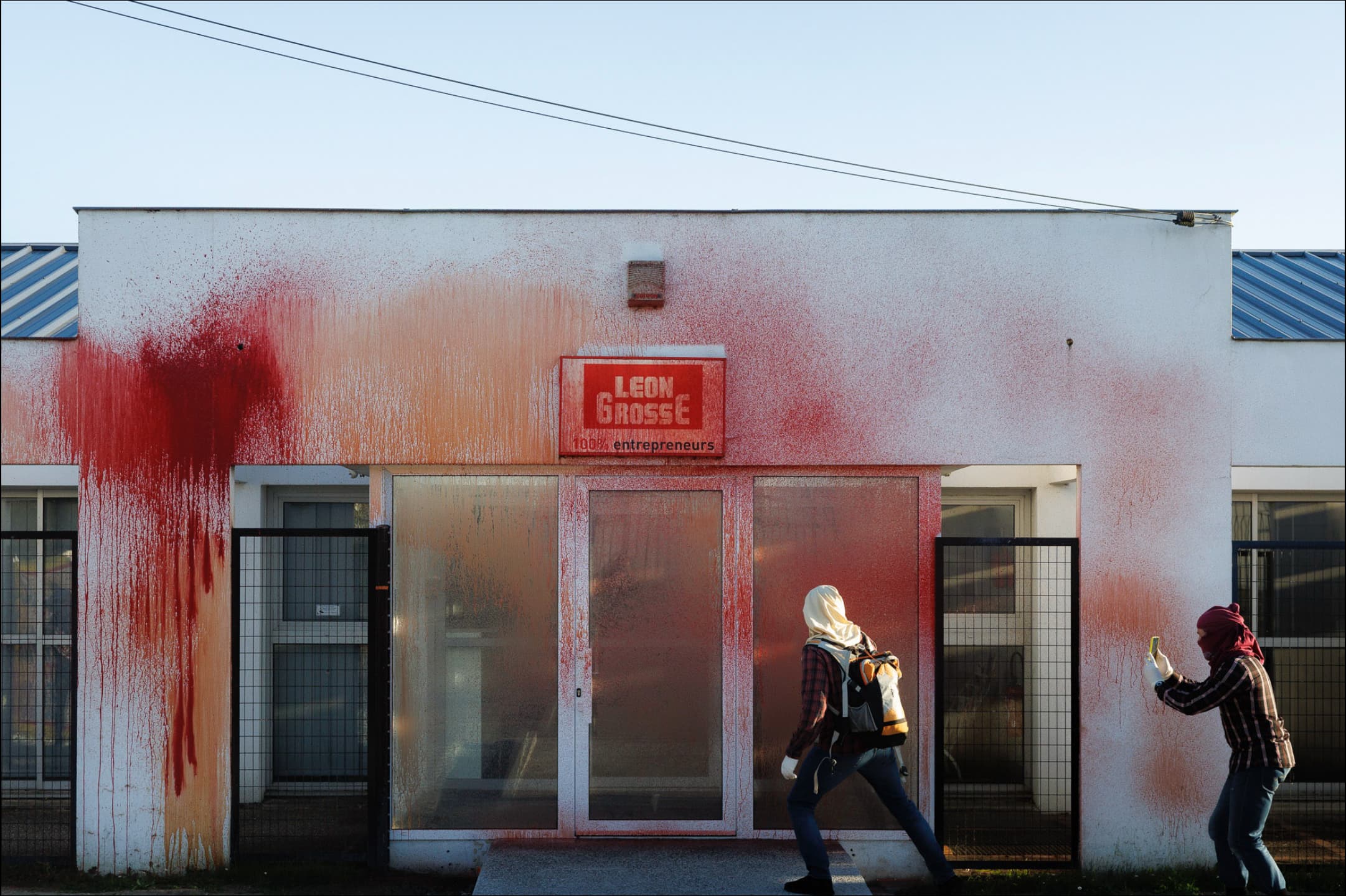 Le dimanche 19 avril, dans la zone industrielle de Saint-Herblain (Loire-Atlantique), des militants d’extrême gauche ont recouvert de peinture rouge la façade du siège de l’entreprise Léon Grosse, le maître d’œuvre du futur Centre de rétention administrative (CRA) de Carquefou.